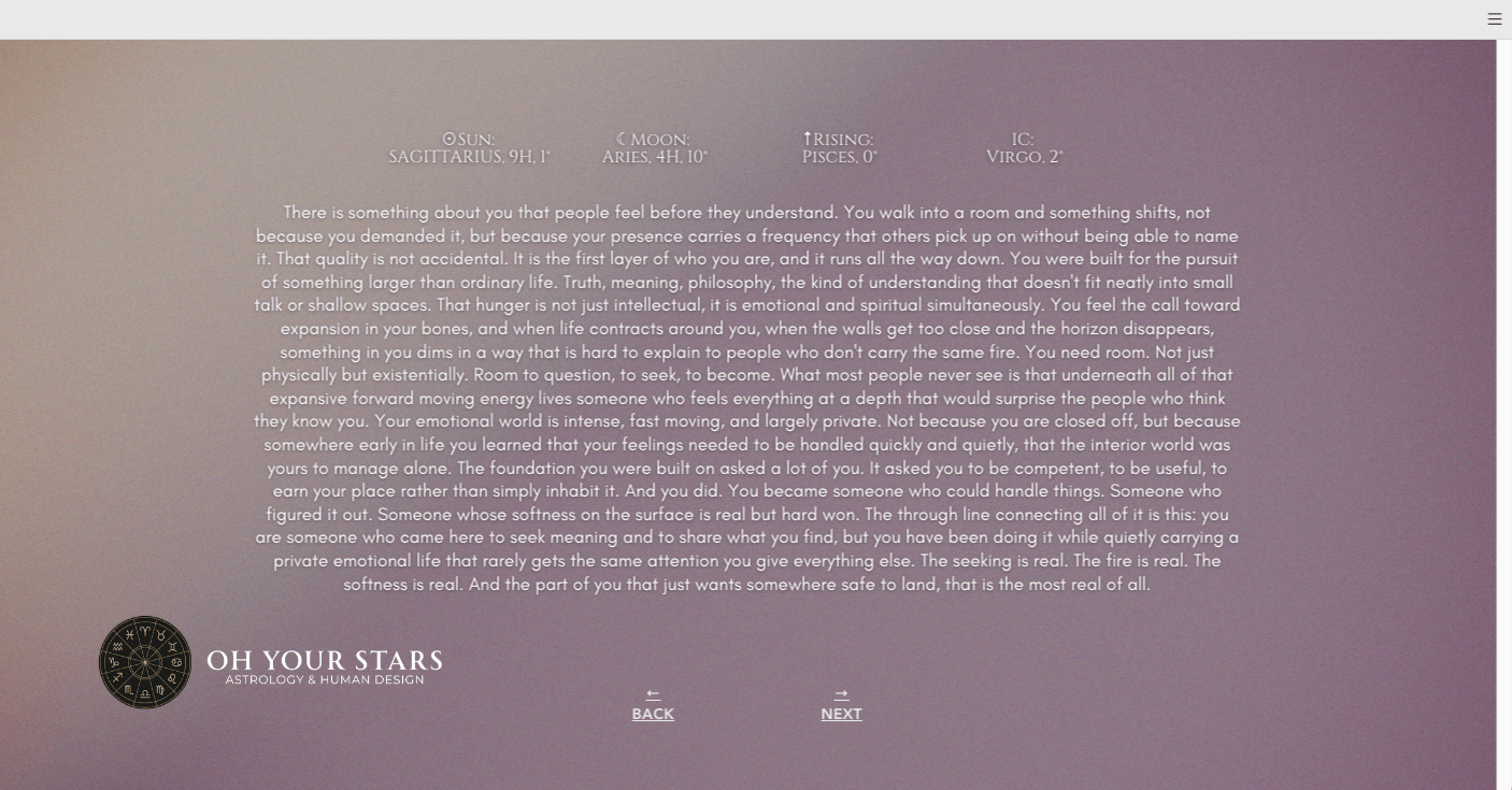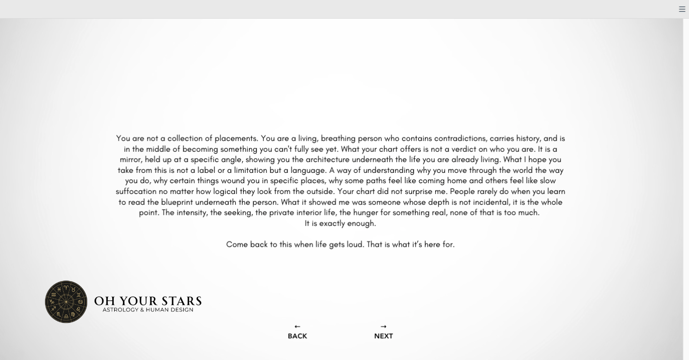 Your Soul Blueprint will include the wisdom of astrology and human design, formatted into a personalized, beautifully designed website that you can return to for guidance. As a bonus, we’ll sit down for a 45-minute private call where we explore your blueprint together. We can talk through your questions and connect the dots between the patterns in your chart and the experiences of your life. You’ll walk away with insights tailored to your journey, plus grounded next steps for living more in flow with who you are. This reading is ideal if you’ve ever read about astrology or human design and thought: “This makes sense, but how do I actually live it?” Together, we’ll bridge that gap.